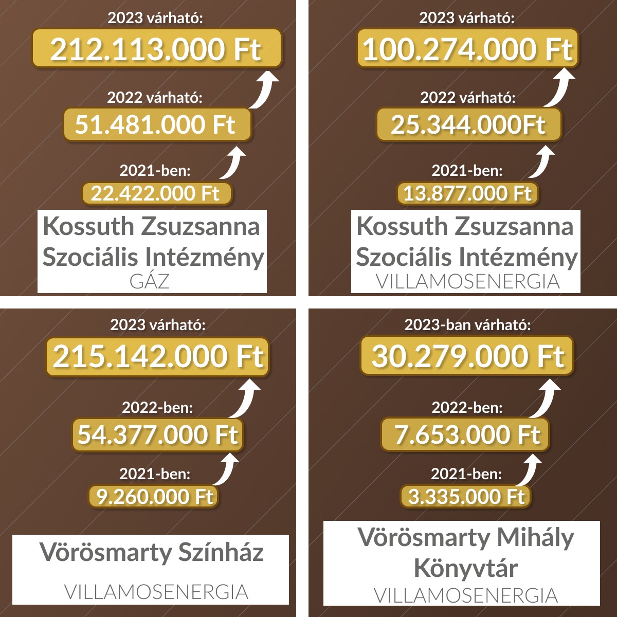 6. Kossuth Zsuzsanna Szociális Intézmény villamosenergia: 2021: 13.877 eFt, 2022-ben várható: 25.344 eFt, 2023-ban várható: 100.274 eFt.