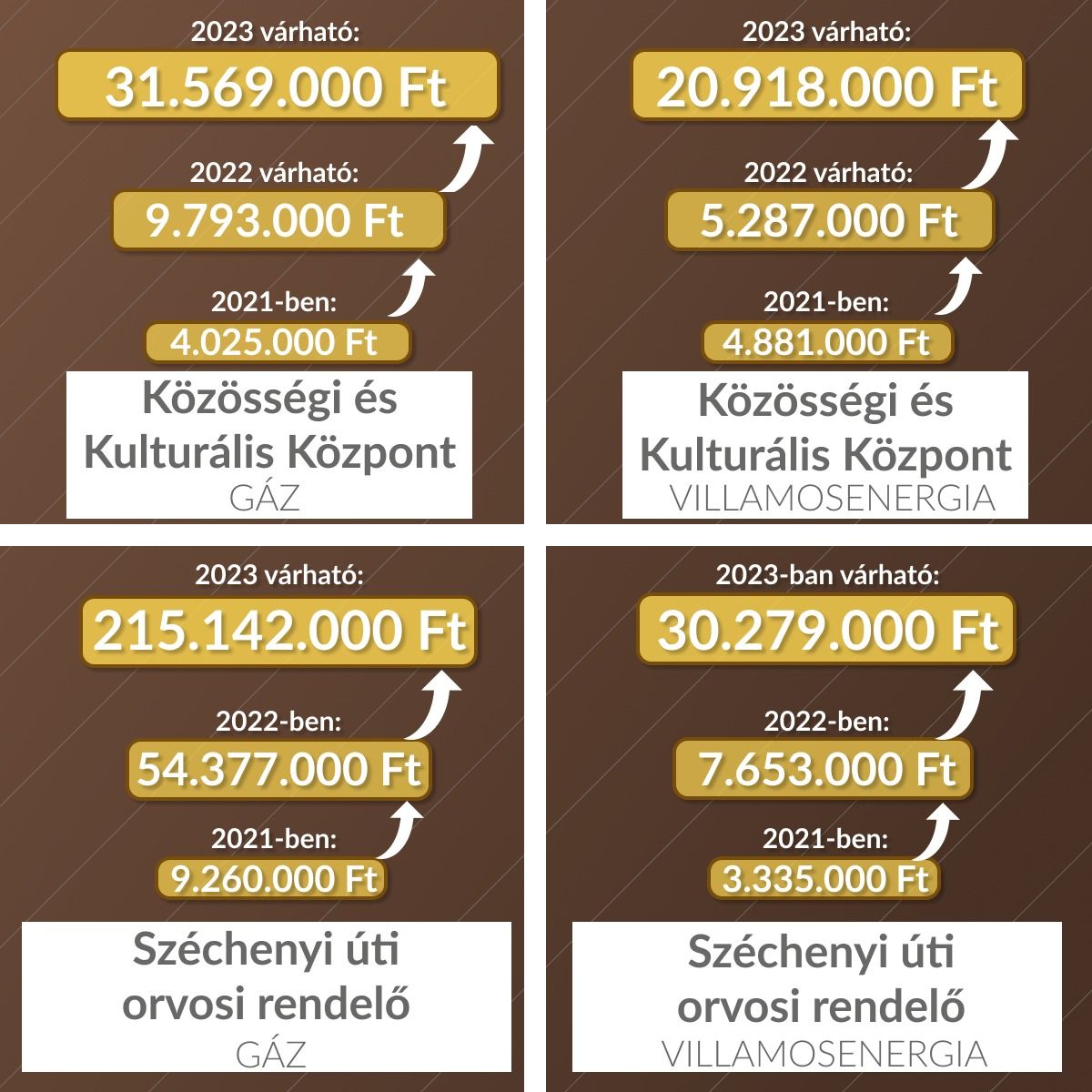 12. Széchenyi út orvosi rendelő villamosenergia: 2021: 726 eFt, 2023-ban várható: 6.223 eFt. Ez a jelentős emelkedés természetesen rendelőnként megjelenik.