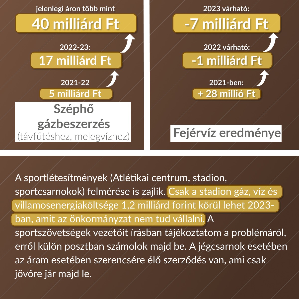 15. A sportlétesítmények (Atlétikai centrum, stadion, sportcsarnokok) felmérése is zajlik. Az egyeztetés a klubokkal megkezdődött. Csak a stadion gáz, víz és villamosenergiaköltsége 1,2 milliárd forint körül lehet 2023-ban, amit az önkormányzat nem tud vállalni. A sportszövetségek vezetőit írásban tájékoztatom a problémáról, erről külön posztban számolok majd be. A jégcsarnok esetében az áram esetében szerencsére élő szerződés van, ami csak jövőre jár majd le.