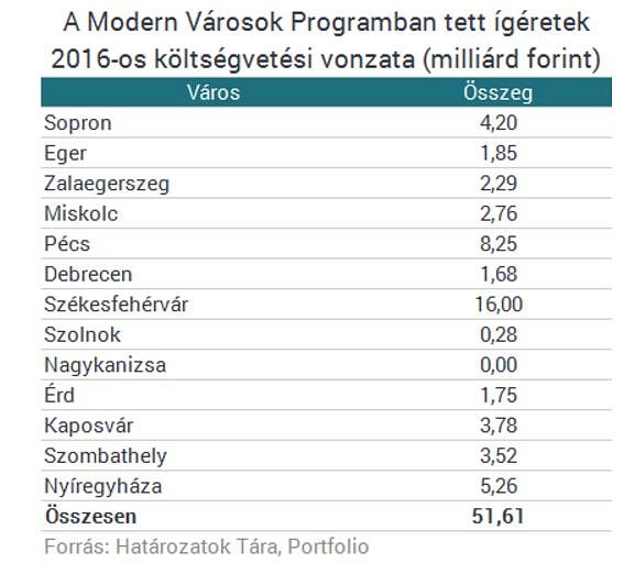 A Modern Várások Program eddigi megállapodásait érintő 2016-os költségvetési vállalásokról listát tett közzé a kormány szerdán. A listából látszik, hogy a legnagyobb idei forrást Székesfehérvár kapja 16 milliárd forinttal, a második helyen Pécs áll 8,25 milliárddal, míg Nyíregyháza fejlesztésére 5,26 milliárd forintot költhetnek idén. Nagykanizsa és Szolnok esetében egyelőre nem vagy csak jelképes anyagi ígéreteket tartalmaz a lista az idei évre.