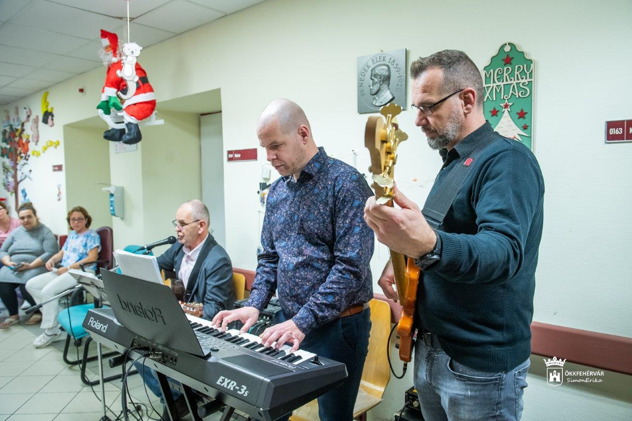 Zsúfolásig telt a Fejér Vármegyei Szent György Egyetemi Oktató Kórház Újszülött, Csecsemő- és Gyermekosztályának „fogadótere” szerda délelőtt, ahol az osztály karácsonyfája körül egyre több izgatott kisgyermek gyülekezett, meghallva Mits Péterék zenekarának készülődését.