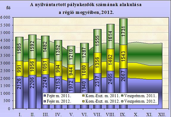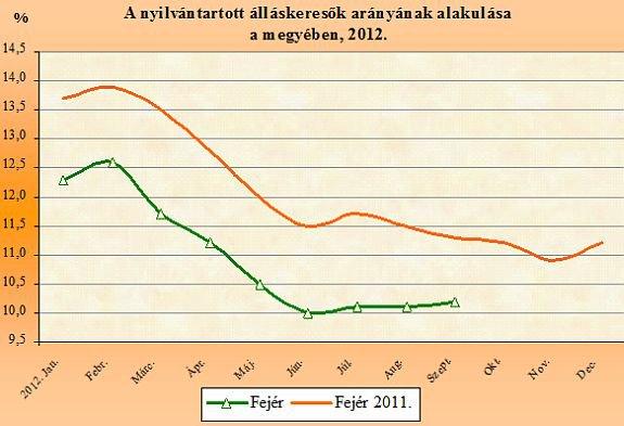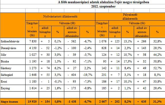 2012. szeptemberében a nyilvántartott álláskeresők száma a Közép-dunántúli régióban 46.803 fő, az előző havinál 926 fővel (2,0%-kal) több, míg az egy évvel korábbinál 2.565 fővel (5,2%-kal) kevesebb. A megyék közül Fejér megyében az előző hónaphoz viszonyítva kis-számú, 154 fős, 0,8 %-os növekedés következett be az álláskeresők számában. A változásoknak köszönhetően szeptember végén Fejér megyében 19.920 fő szerepelt a regisztrációban.