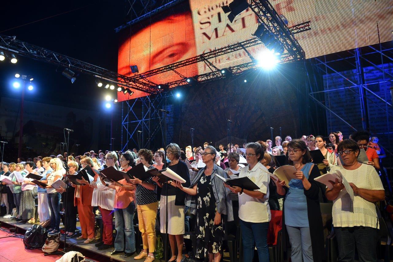 Egyedülálló komolyzenei koncerttel folytatódik az ünnepi rendezvénysorozat a Nemzeti Emlékhely színpadán. Rossini Stabat Mater című egyházi művét a Nagyboldogasszony-bazilika romjai felett adják elő Drahos Béla vezényletével a Kossuth- és Liszt-díjas érdemes művész Rost Andrea, valamint a moszkvai Bolsoj Színház vezető szólistái, Svetlana Shilova, Maxim Paster és Petr Migunov.