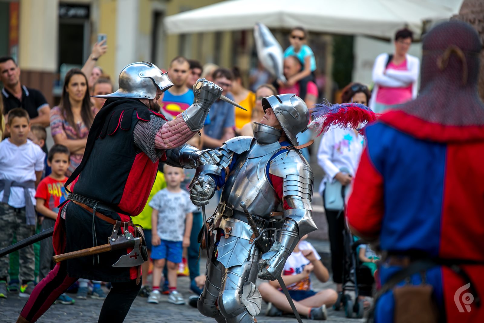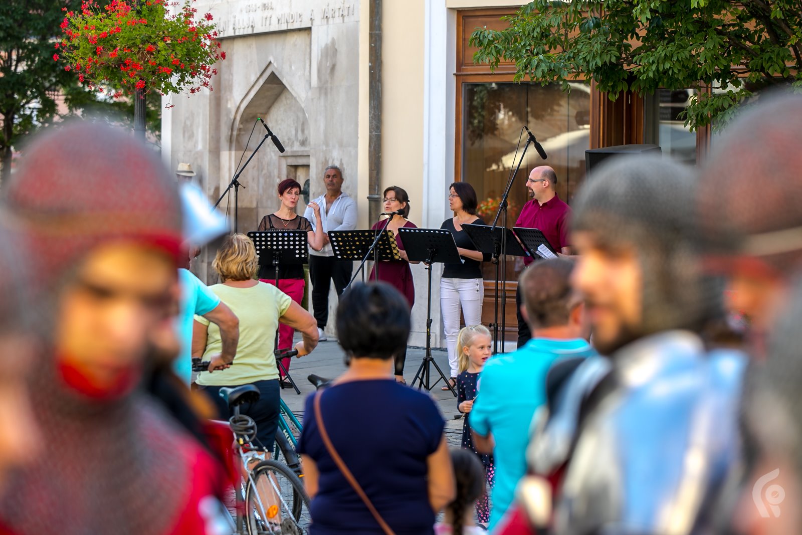 A Városház téren, most is népes gyerekközönség várta a hagyományőrzők bemutatóját, akik nem is okoztak csalódást. A Fő utcán végigvonulva dobpergés jelezte a Magyar Királyi Kardforgatók Rendjének érkezését, hogy aztán a lovag urak békésen beszélgetve várják ki sorukat. Az egyik páncélos vitéz csörögve-zörögve járkált az ismerősök között, nem kis ijedelmet okozva ezzel egy apró fiúcskának. Egy másik lovag fagylaltot kóstolgatott, két társa pedig – a zord külsőt meghazudtolva – elandalodva hallgatta a téren szálló lágy dallamokat. De amikor aztán rájuk került a sor, vérbeli harcosokká alakultak mindannyian, kemény összecsapásokban mutatták meg a nézőknek, milyen is lehetett sok száz évvel ezelőtt egy igazi csata. Vér persze nem folyt, de a fegyverek, a pajzsok csattogása igencsak élethű volt – legalábbis a gyerekközönség szemében látható áhítat ezt mutatta.