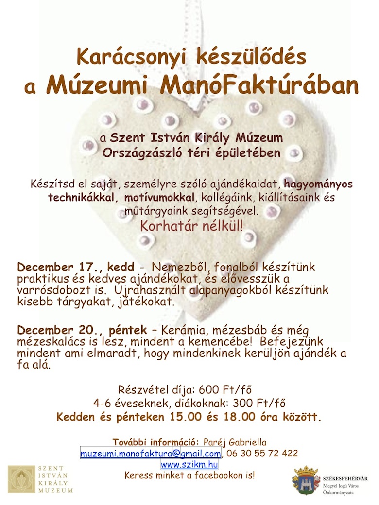 December 17-én és december 20-án, kedden és pénteken 15 óra és 18 óra között várják az alkotni vágyó látogatókat a Szent István Király Múzeum Országzászló téri épületében. A karácsonyi készülődés jegyében az érdeklődők a Múzeumi ManóFaktúrában hagyományos technikákat és motívumokat alkalmazva készíthetnek ajándékokat és díszeket.