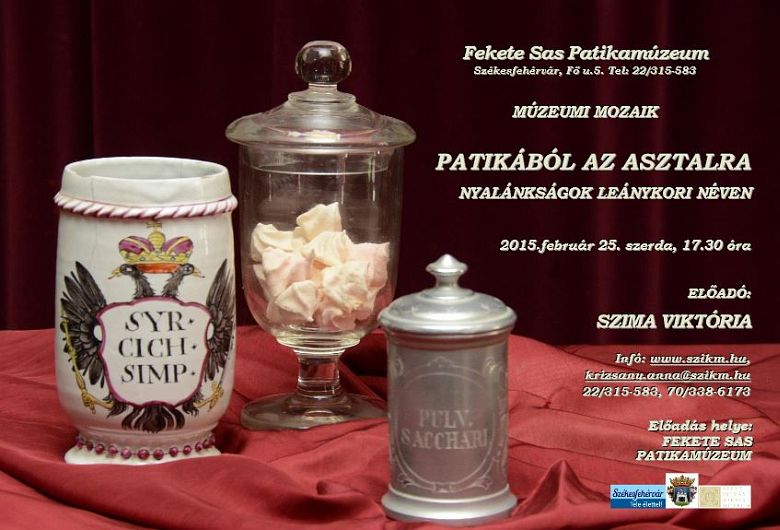 A Múzeumi Mozaik keretében február 25-én szerdán 17.30 órakor folytatódik a Patikából az asztalra sorozat, amely ezúttal "Nyalánkságok leánykori néven" címmel jelentkezik. Az előadó Szima Viktória lesz, az előadásról további információt a Szent István Király Múzeum honlapján találhatnak az érdeklődők.