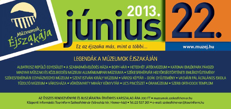 A Múzeumok Éjszakája című kulturális programot – az 1999-ben indult francia példa nyomán – 2003 óta rendezik meg minden évben hazánkban amolyan könnyed, nyáresti kirándulásként. Székesfehérvár ismét csatlakozott az országos kezdeményezéshez, idén 17 szervezet egyedülálló összefogásának köszönhetően 21 helyszínen 63 programmal várják a nagyközönséget június 22-én, szombaton, az év leghosszabb napján, Szent Iván éjszakáján. A délelőtt 10 óra és éjfél között zajló programokban szerepelnek gyermek- és családi foglalkozások, előadások, tárlatvezetések, de lesz színpadi program, lovagi bemutató, távcsöves bemutató, koncert és sok egyéb más is.