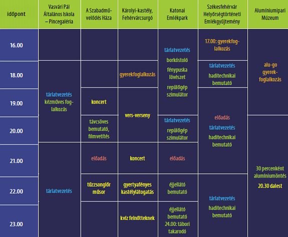 Idén 12 székesfehérvári és vidéki szervezet fogott össze, hogy a látogatók minőségi kulturális élményekben részesülhessenek. A vidéki helyszínek között ingyenes buszjáratok közlekednek. Újdonság, hogy a rendezvényeket kizárólag karszalaggal lehet látogatni, melyek minden helyszínen belépőként, az Alba Volán helyi buszjáratain pedig menetjegyként használhatók.