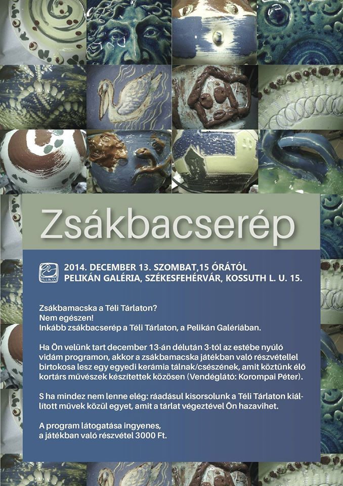 Advent harmadik hétvégéjén is Művészeti Vásárt tartanak a Pelikán Galériában, ahol a Székesfehérvári Művészek Társasága képző- és iparművészeti alkotásaiból, közvetlenül a művészektől, műtermi áron válogathatnak az érdeklődők. Szombaton 10 órától Tóth Adrien grafikusművész lesz a házigazda, délután pedig "Zsákbacserép" című programon az egyedi kerámiacsészék kerülnek a középpontba.