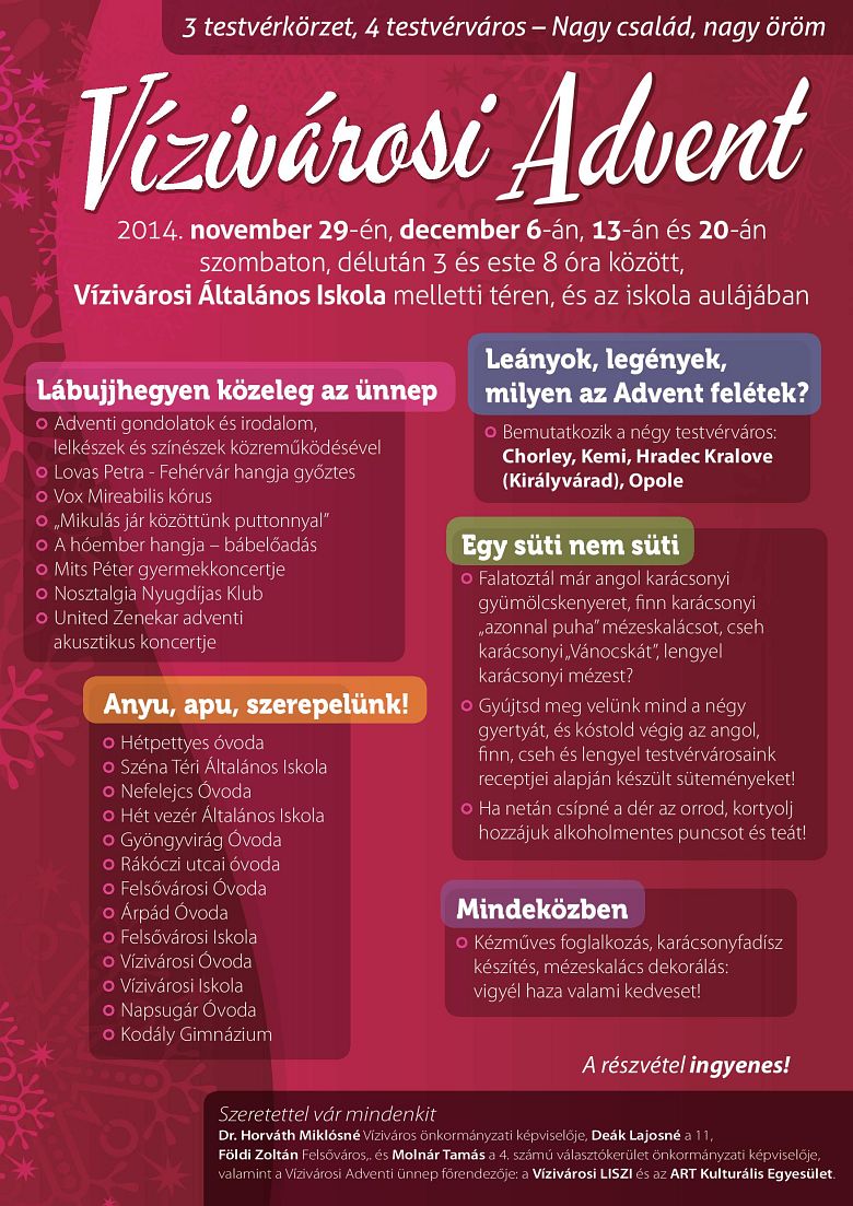 Rendkívül gazdag programkínálattal készülnek az ünnepvárás heteire Székesfehérváron. A városi közös rendezvények mellett számos intézmény és szervezet várja saját műsorral az érdeklődőket. 2014-ben újabb hagyománnyal gazdagodik az adventi időszak, hiszen a történelmi Víziváros hagyományait ismét életre keltve közös programsorozatot szervez a 3., 4., 10. és 11. számú választókörzet a LISZI Vízivárosi Irodájával közösen. Dr. Horváth Miklósné, Deák Lajosné, Földi Zoltán és Molnár Tamás önkormányzati képviselők kezdeményezésére minden adventi szombaton 15 és 20 óra között várják a családokat a Vízivárosi Általános Iskola melletti, megújult közösségi téren. A tervezett programról szerdán sajtótájékoztatón számoltak be.