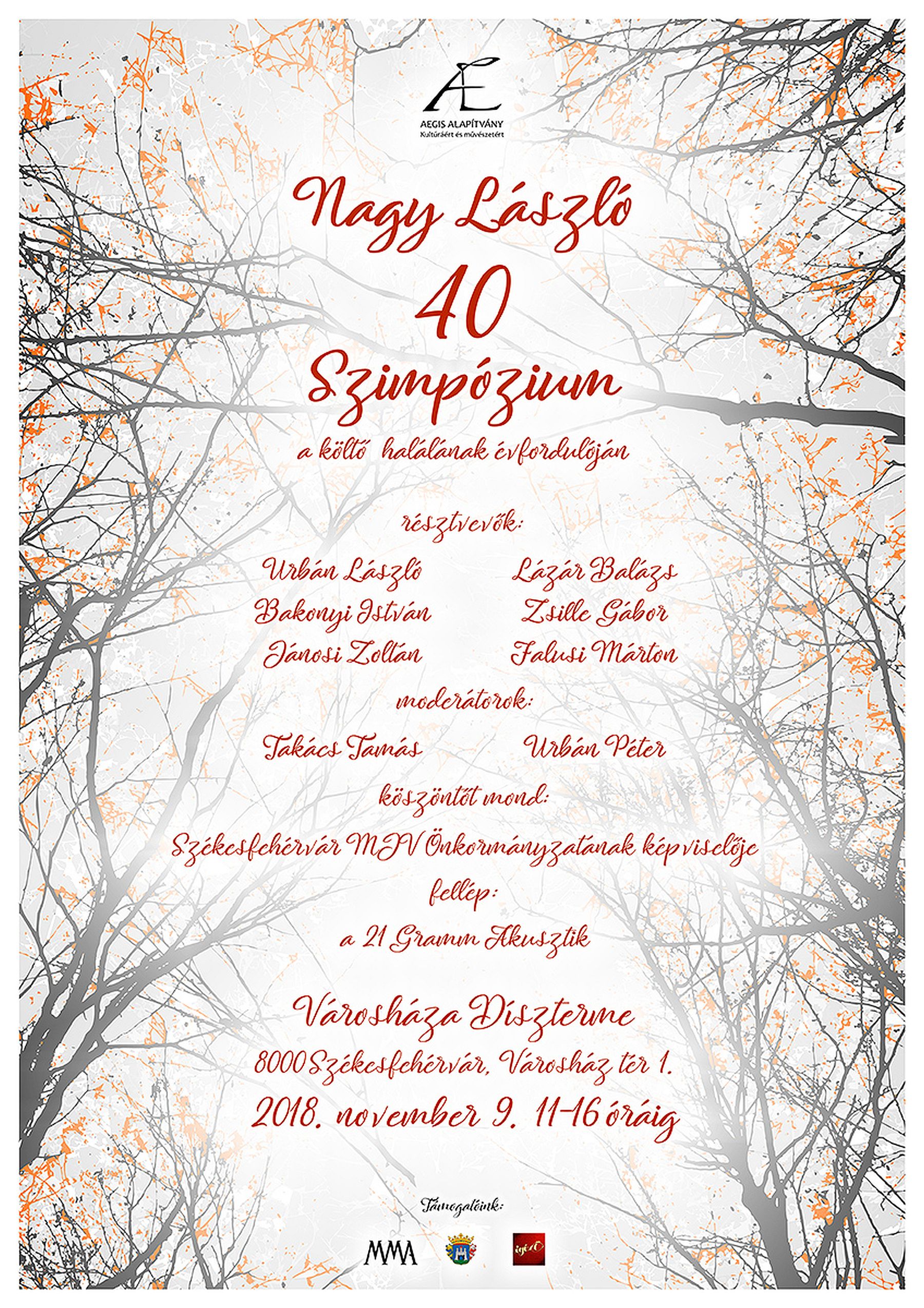 Az Aegis Kultúráért és Művészetért Alapítvány november 9-én 11 órától Nagy László 40 címmel tart szimpóziumot a Városházán, a Magyar Művészeti Akadémia és Székesfehérvár Önkormányzatának támogatásával.