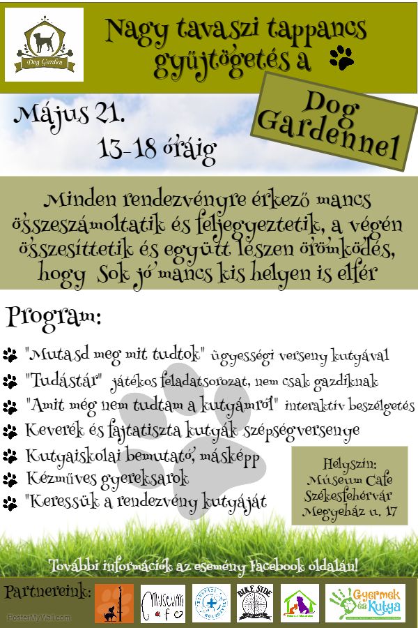 Kétlábúkat és négylábúkat várnak közös délutáni dzsemborira május 21-én, szombaton a Múzeum Café-ba, ahol megmutathatja mindenki kedvence ügyességét, szépségét, próbára teheti tudását kutyás témákban. A jó hangulat garantált, azt pedig, hogy sok jó mancs kis helyen is elfér, egy rettentő hosszú szalaggal fogják bizonyítani, amin minden eb vendég tappancsát megörökítik és számolják.
