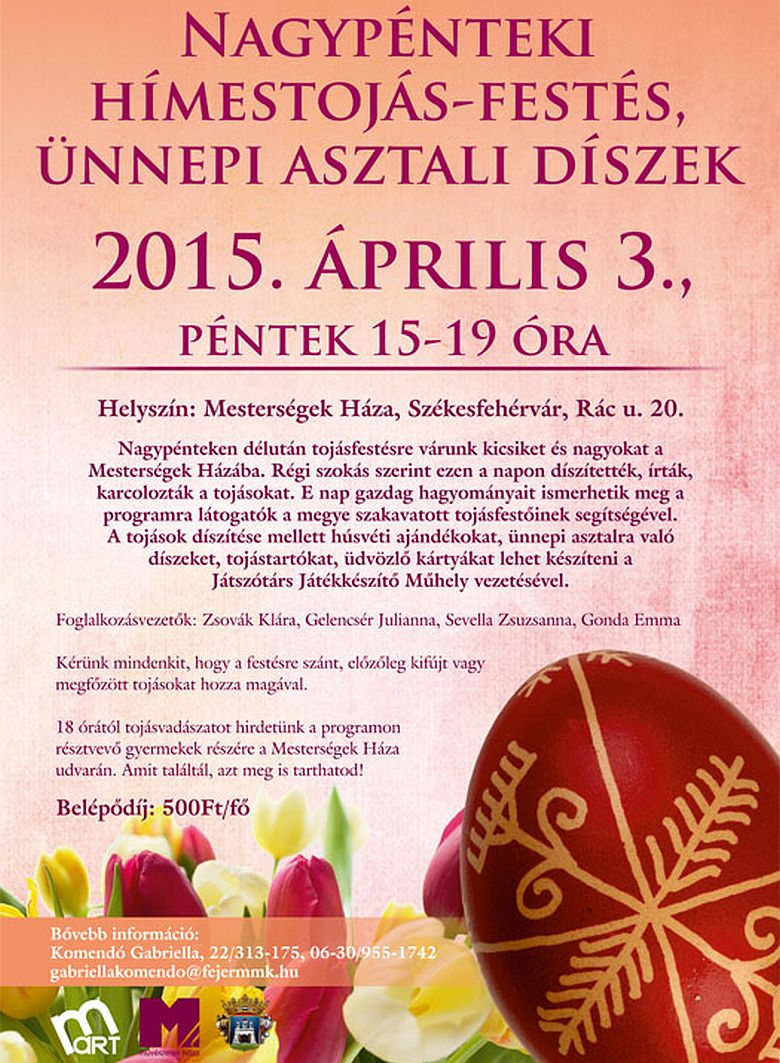 Nagypénteken délután tojásfestésre várnak kicsiket és nagyokat a Mesterségek Házába (Rác utca 20.). Régi szokás szerint ezen a napon díszítették, írták, karcolozták a tojásokat. E nap gazdag szokásait ismerhetik meg a programra látogatók a megye szakavatott tojásfestőinek segítségével. A tojások díszítése mellett húsvéti ajándékokat, üdvözlő kártyákat, tojástartókat lehet készíteni a Játszótárs Játékkészítő Műhely vezetésével.