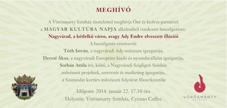 Nagyvárad a XX. század elején a magyar kulturális élet kiemelkedő központja volt. Ady Endre „Pece-parti Párizsnak” nevezte a partiumi várost. A Vörösmarty Színház idén Nagyváraddal közösen ünnepeli a magyar kultúra napját. Január 22-én, szerdán 17.30.kor „Nagyvárad, a kétlelkű város, avagy Ady Endre elveszett illúziói” címmel tartanak beszélgetést a színház Cyrano Kávézójában.