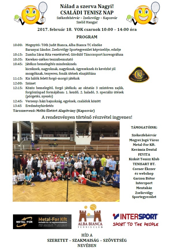 A mozogni vágyók szombaton megismerkedhetnek a játékos tenisz-feladatokkal, valamint lesz kerekes-székes teniszbemutató, zumba, délután pedig versenyre is nevezhetnek, melyen kipróbálhatják magukat a családok, de egyéni versenyzőket is várnak. Tóth Judit Bianca az Alba Bianca Tenisz Club vezetője az egyik legfontosabb dolognak a generációk közötti kapcsolatot nevezte. Mint mondta három dolog van a fókuszban: a szeretet, a szakmaiság és a szövetség. A rendezvényen történő részvétel ingyenes. Az érdeklődőket feburár 18-án várják délelőtt10 órától 14 óráig a Videoton Oktatási Központba.
