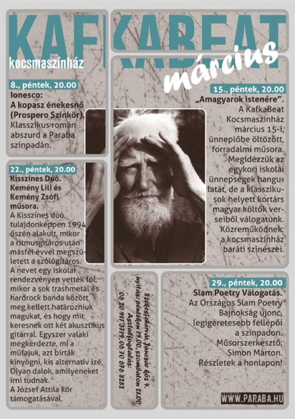 Márciustól péntek esténként rendezik meg a KafkaBeat Kocsmaszínház előadásait. A szervezők bíznak benne, hogy a közönség velük tart az új időpontra is, a továbbiakban pedig azok is ellátogatnak a Kocsmaszínház előadásaira, akik hétköznap este kevésbé mozdulnak ki. Március 8-án Ionesco: A kopasz énekesnőcímű darabját játsszák, március 15-én pedig kortárs magyar költők verseiből válogatnak az ünnep tiszteletére.