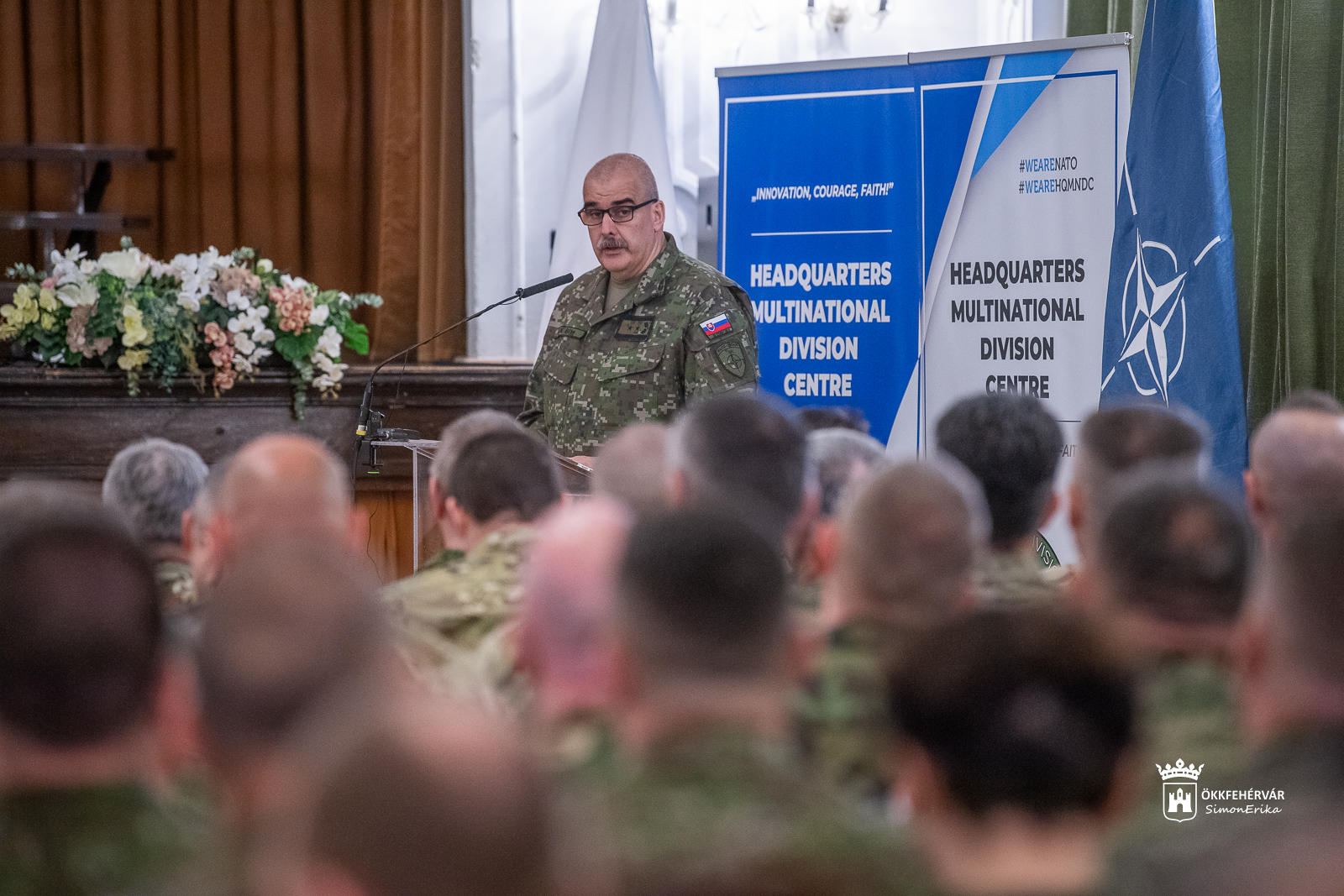 Tibor Králik vezérőrnagy, a Közép-európai Többnemzeti Hadosztály-parancsnokság parancsnoka beszédében elmondta: nem kell nagyon a dolgok mélyére nézni, hogy lássuk a NATO létjogosultságát. Az évtizedek alatt a 12 tagországból álló Szövetség olyan országokkal bővült, akik közös célokon túl közös értékeken is osztoznak. Elismerően szólt arról, hogy a NATO különböző kultúrával, történelemmel rendelkező országai hogyan alkotnak egy nagy egységet. „A küldetéseinek középpontjában a közös értékeink és határaink megvédése áll. A szabadság, a demokrácia, az emberi jogok és a törvények tisztelete vezet minket ezen az úton. Ezek pedig nem csak papírra vetett szavak, hanem Szövetségünk alapkövei, és azon leszünk, hogy megvédjük őket.” – fogalmazott a parancsnok, aki az orosz agresszióról és a Közel-Keleten zajló háborúkról is szólt. Emlékeztetett, hogy az Ukrajnát ért támadás nem csak a régió stabilitását veszélyezteti, de szembe megy azokkal az elvekkel is, melyeket a NATO képvisel.