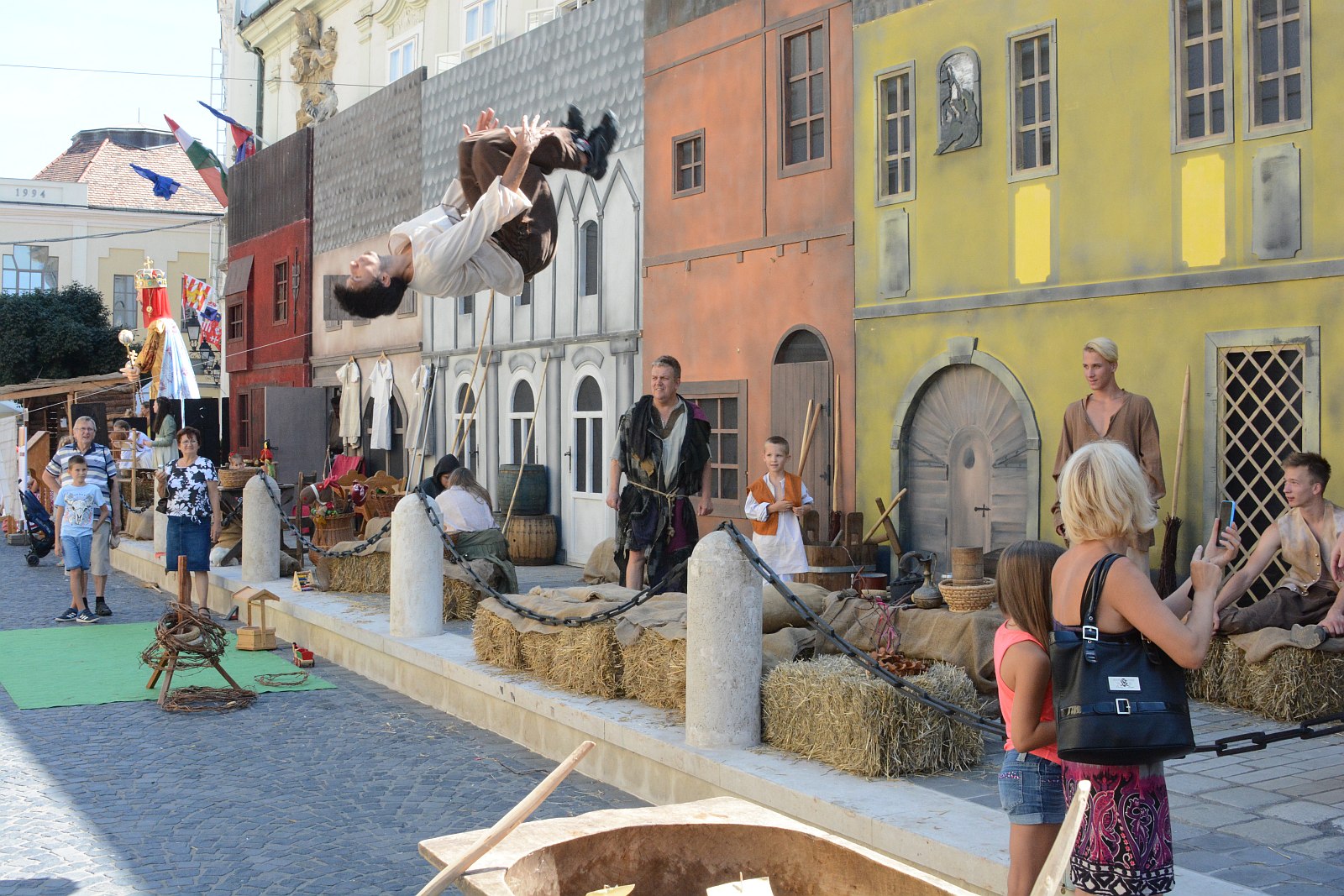 Középkori sokadalom lesz a Városház téren a Szabad Színházzal: piaci perpatvarok, vásári életképek, pergő nyelvű kofák, korhely komédiások és dévaj mutatványosok várják a térre betérőket. Rengeteg játék, korcsmaszínház, interaktív előadás, tréfás verseny lesz a három nap során, esténként pedig a Pannon meséken át ismerkedhetünk a térség középkori életével.