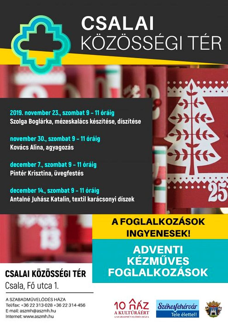 Négy részből álló adventi kézműves foglalkozás-sorozat indul a Csalai Közösségi Térben. Az adventi időszakban szombat délelőttönként, 9 és 11 óra között várják a kreatív kikapcsolódásra vágyó gyerekeket és szüleiket, a nyitó program november 23-án lesz.
