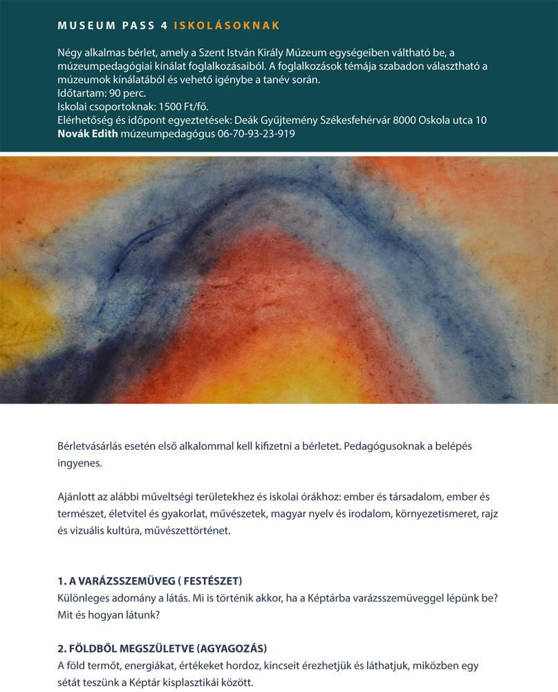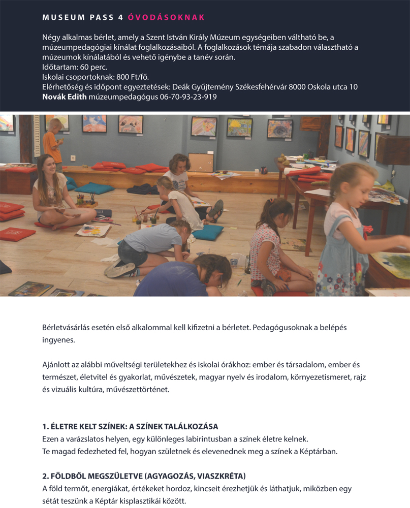 A Szent István Király Múzeum négyalkalmas bérletet hirdet iskolásoknak és óvodásoknak, amellyel a múzeum pedagógiai foglalkozásokon vehetnek részt a csoportok. A program kínálatában több tanórához, műveltségi területhez találhatók témák, a pedagógusok számára a belépés ingyenes. A kisebbek számára 60, a nagyobbaknak 90 perces programot ajánlanak.