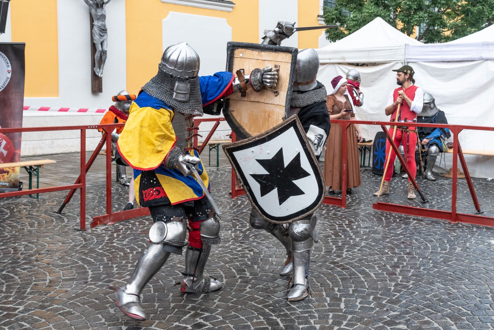 30-40 kg-os páncélban, karddal és pajzzsal felszerelkezve rontottak egymásnak a lovagok a Városház téren felállított ringben.