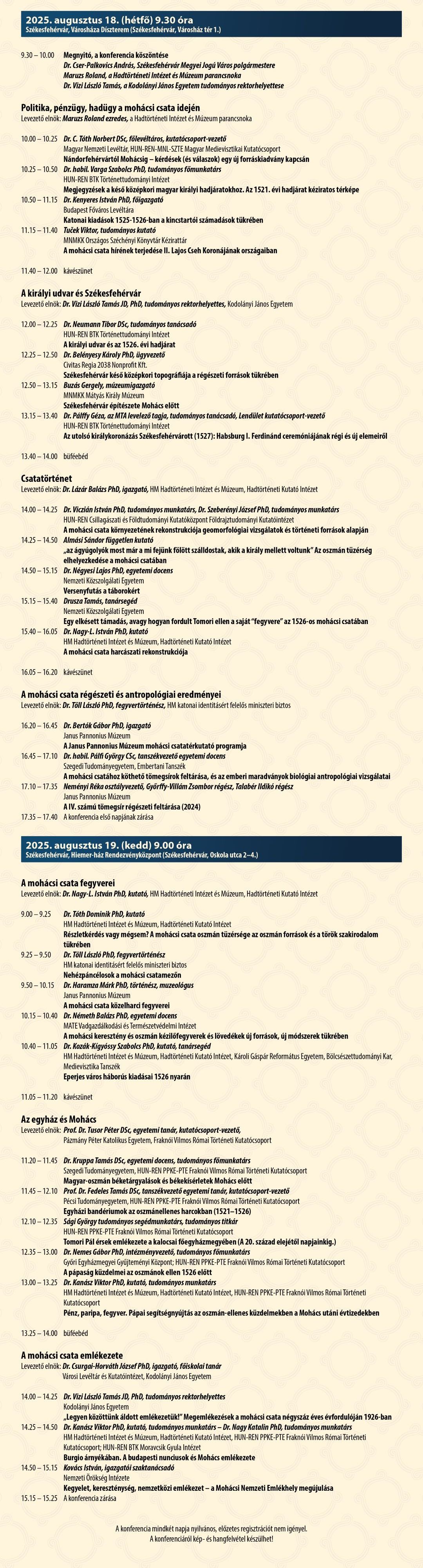 A megnyitó augusztus 18-án, hétfőn 09.30 órakor kezdődik a Városháza Dísztermében, a résztvevőket dr. Cser-Palkovics András polgármester, Maruzs Roland, a Hadtörténeti Intézet és Múzeum parancsnoka és dr. Vizi László Tamás köszönti. A konferencia ezt követően a Politika, pénzügy, hadügy a mohácsi csata idején című szekcióval indul, amely új forráskiadványokról, középkori hadjáratok kéziratos térképeiről, katonai kiadásokról és a csata hírének terjedéséről ad képet. Ezt követően A királyi udvar és Székesfehérvár blokk előadásai a királyi udvar szerepétől a város késő középkori topográfiáján át az utolsó székesfehérvári királykoronázásig terjednek. A Csatatörténet szekcióban geomorfológiai rekonstrukciók, az oszmán tüzérség elhelyezkedése, a hadműveletek sajátos mozzanatai és a harcászati rekonstrukció kerülnek fókuszba. A nap zárásaként A mohácsi csata régészeti és antropológiai eredményei részben a csatatérkutatás és a tömegsírok feltárásának legújabb eredményeit ismertetik.