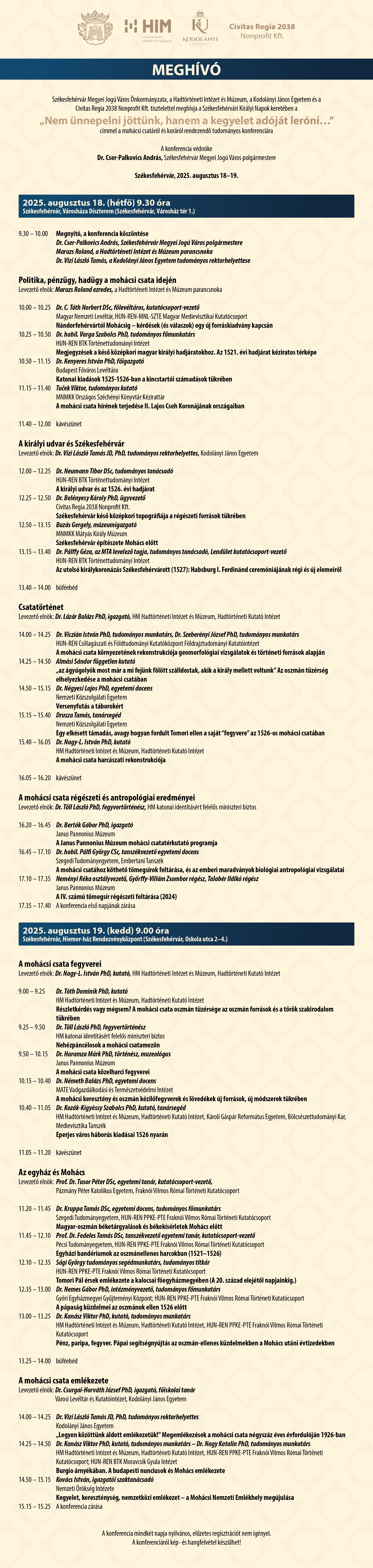 „Nem ünnepelni jöttünk, hanem a kegyelet adóját leróni…” címmel a mohácsi csatáról és koráról rendez tudományos konferenciát a Kodolányi János Egyetem, Székesfehérvár Megyei Jogú Város és a Hadtörténeti Intézet és Múzeum 2025. augusztus 18-19-én Székesfehérváron.