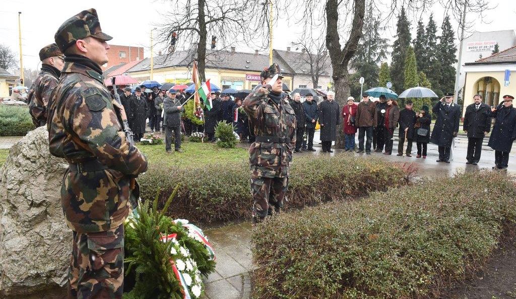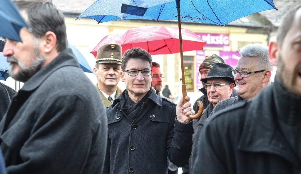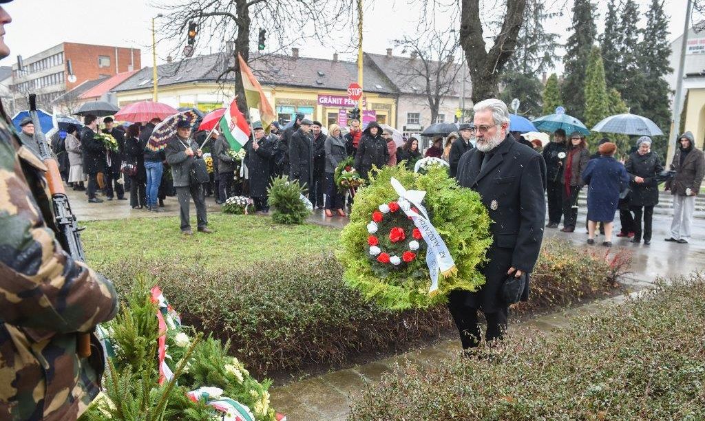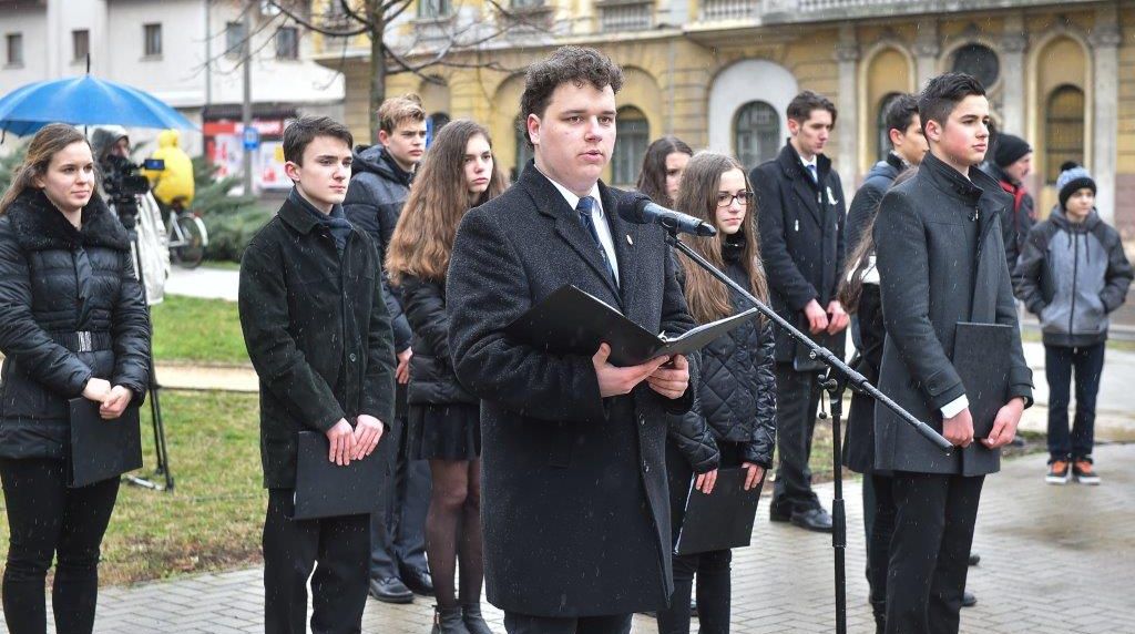 Székesfehérvár polgármestere, dr. Cser-Palkovics András megköszönte a Ciszterci Szent István Gimnázium fiataljainak helytállását, akik maguk kérték, hogy a zord időjárás ellenére tiszteletük jeleként előadhassák műsorukat. A polgármester a Kommunizmus Áldozatainak Emléknapja kapcsán hangsúlyozta, a kommunizmus sötét, kemény, áthatolhatatlan fal volt. „Feltartott, korlátozott… Félelem, kényszerű lelkesedés, tettetett jókedv, hamis hírek, Patyomkin-falvak, sztahanovisták, lehallgatók és besúgók, öntörvényű, zárt világ volt… Eközben életek törtek meg, nemzedékeken át épített egzisztenciák vesztek a semmibe, tehetségek kerültek süllyesztőbe érdemtelenek miatt…” Mint kiemelte: „Felelősségünk… és nem csak ezen a napon, de ma különösen, hogy emlékezzünk és emlékeztessünk. Hogy elbeszéljünk és megértessünk. Mert az erőszakos, gyilkos eszmék olyanok, mint a szívós gyom. Ha látni már nem is látjuk a felszínen, lenn, a tudatlanság rétegeiben újra erőre kapnak és tovább terjeszkednek. Tudjuk és tudassuk mindenkivel, mit tett és mit tehet a kommunista diktatúra, hogy ne tudjon még egyszer magokat érlelni!”