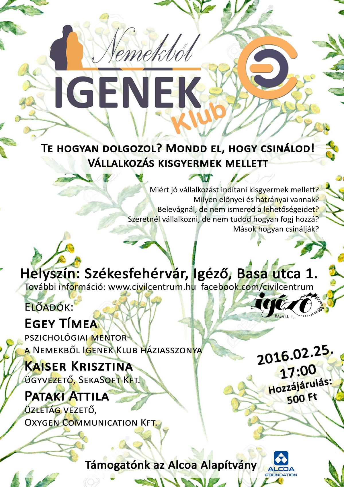 A Civil Centrum Közhasznú Alapítvány február 25-én 17 órakor rendezi meg a Nemekből Igenek Klubot, melynek témája: vállalkozás kisgyermek mellett. A résztvevők választ kaphatnak többek között olyan kérdésekre, mint hogy miért jó vállalkozást indítani kisgyermek mellett, milyen előnyei és hátrányai vannak?