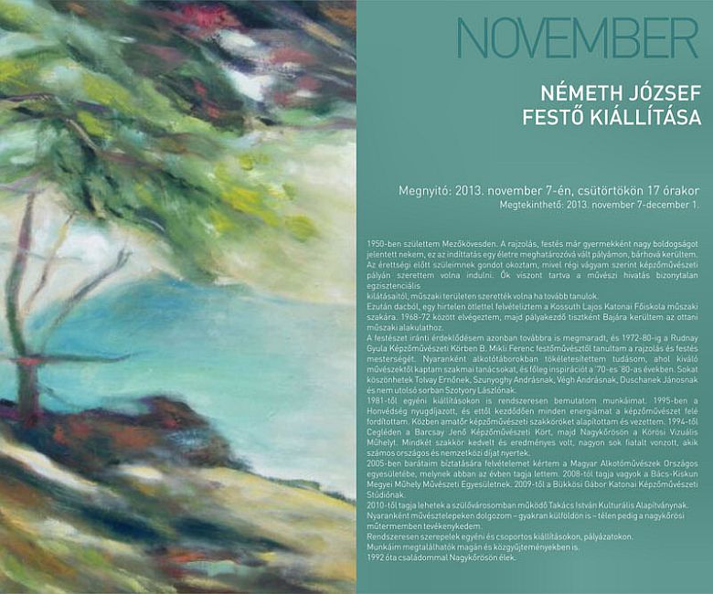 Németh József festőművész alkotásaiból nyílik kiállítás november 7-én, csütörtökön 17 órakor a Művészetek Háza kiállítótermében. Bevezetőt mond Juhász Zsófia, az intézmény igazgatója, utána kötetlen beszélgetést rendeznek a művésszel. A kiállítás december 1-ig tekinthető meg.