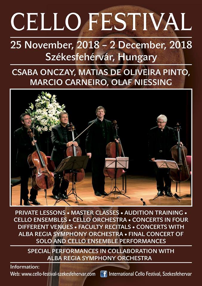 Németország, Brazília és Chile után Székesfehérváron rendezik a 4. Nemzetközi Csellófesztivált, melyen a mesterkurzusok és a magánórák mellett több helyszínen koncertekkel örvendeztetik meg a fehérváriakat a világ minden tájáról érkező kiemelkedő csellisták.