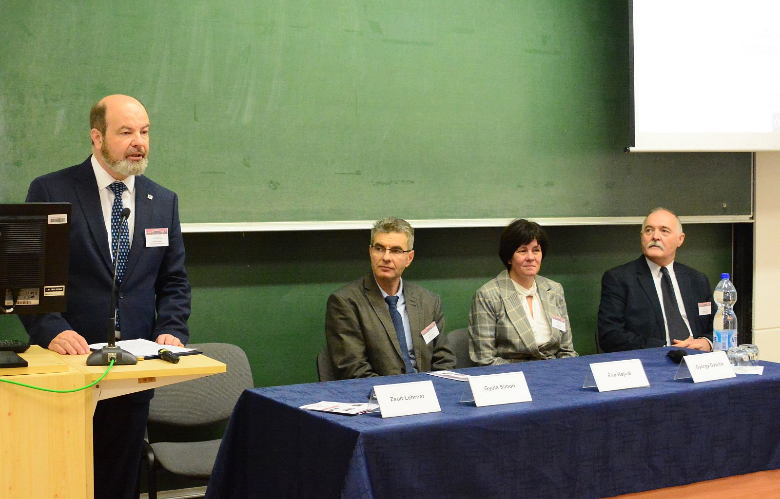 Dr. Hajnal Éva egyetemi docens kutatási dékánhelyettes és Dr. Simon Gyula professzor mellett Dr. habil. Györök György, az Óbudai Egyetem Alba Regia Műszaki Kar dékánja köszöntötte a konferencia résztvevőit.