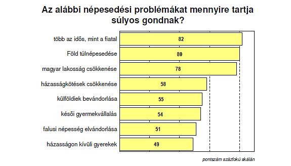 A magyar lakosság számának csökkenését, a népesség elöregedését és a Föld túlnépesedését mind a nők, mind pedig a férfiak ugyanolyan súlyos kérdésnek tartják, azonban a többi népesedési problémát a nők nagyobb gondnak tartják, mint a férfiak. Életkor alapján az id2sebb generációk jobban aggódnak ezen kérdések miatt, a 60 éven felüliek minden problémát súlyosabbnak látnak, mint a fiatalabbak.