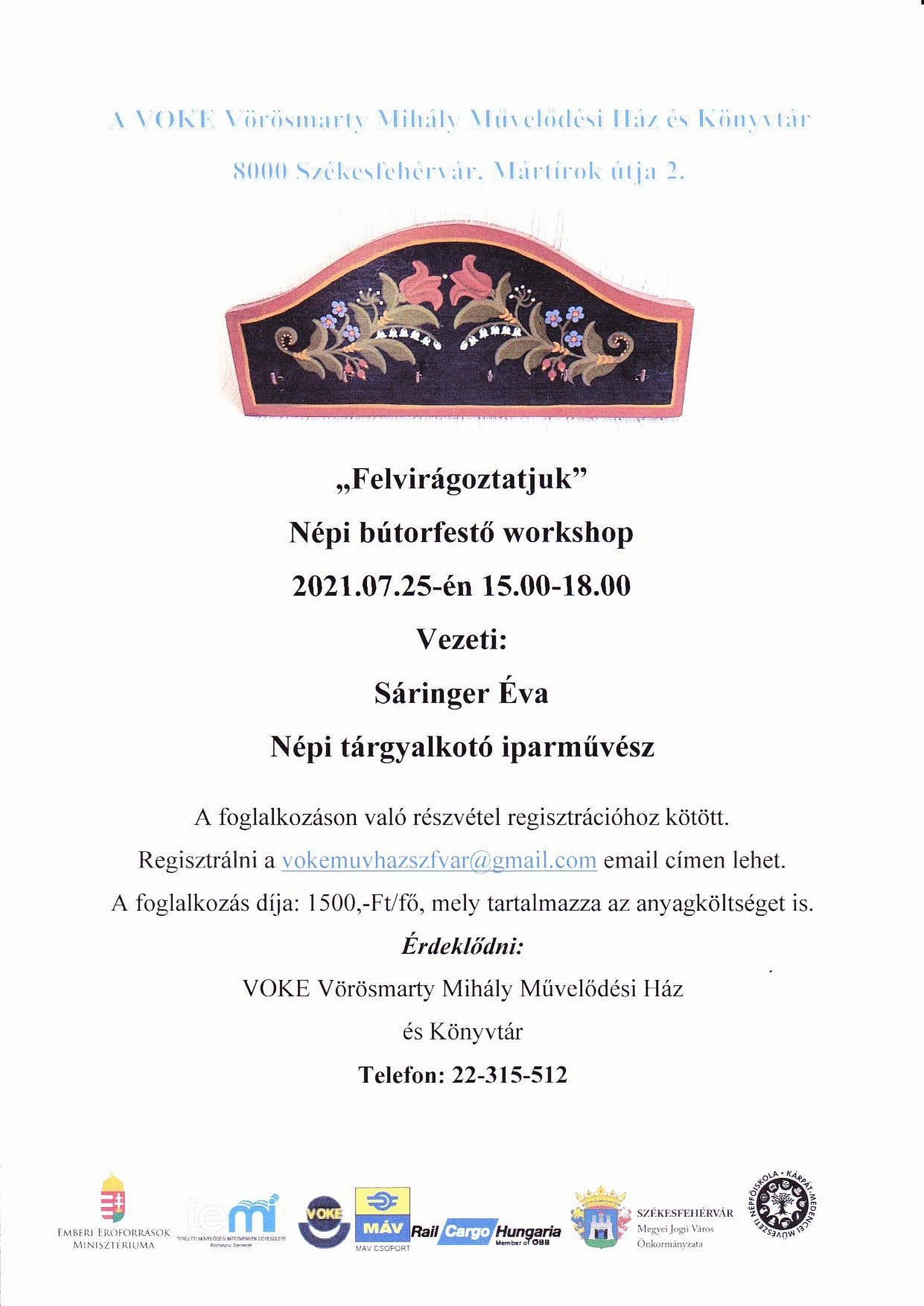 Sáringer Éva népi iparművész közös alkotásra várja az érdeklődőket: július 25-én, vasárnap 15 órától a VOKE Vörösmarty Művelődési Házban lesz bútorfestő foglalkozás, Felvirágoztatjuk címmel. A résztvevők kisebb tárgyakat festenek majd, elsajátítva néhányat a népművészet színes, autentikus motívumaiból.