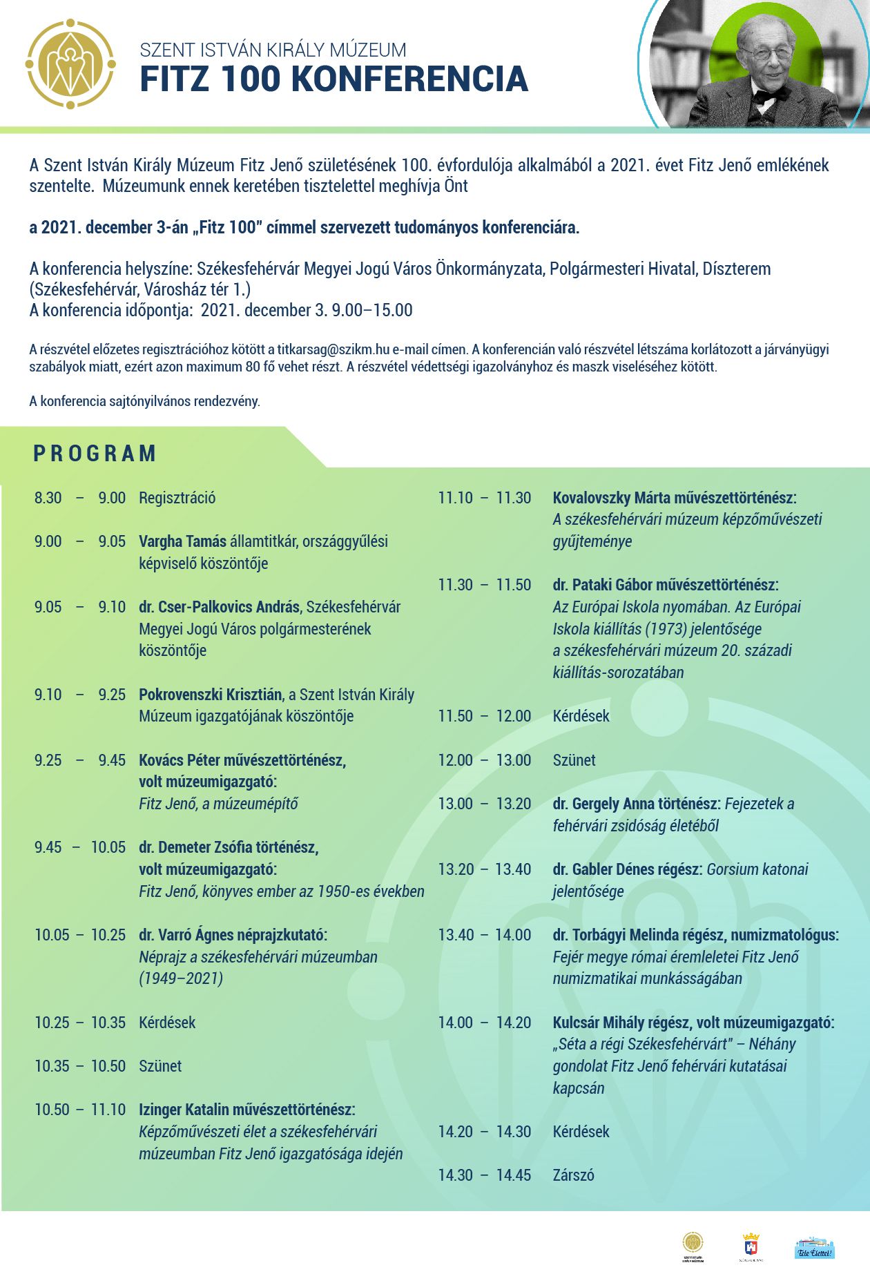 A rendezvényt dr. Cser-Palkovics András polgármester, Vargha Tamás államtitkár és Pokronvenszki Krisztián, a Szent István Király múzeum igazgatójának köszöntője nyitja meg. Ezt követően Fitz Jenő, a múzeumépítő és Fitz Jenő, könyves ember az 1950-es években címmel hallhatunk előadást a múzeum két korábbi igazgatójától, Kovács Pétertől és dr. Demeter Zsófiától. Az előadások egészen 15 óráig folyamatosan folynak, köztük pedig az interaktivitás jegyében lehetőség lesz kérdéseket is feltenni a szakembereknek.
