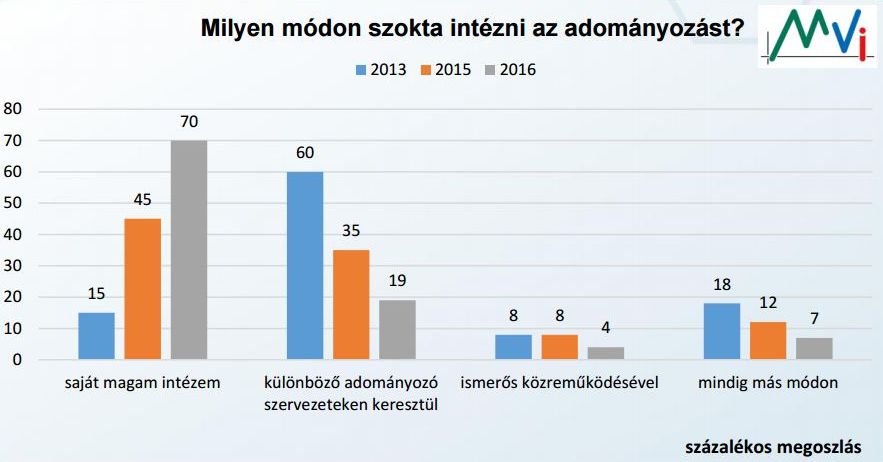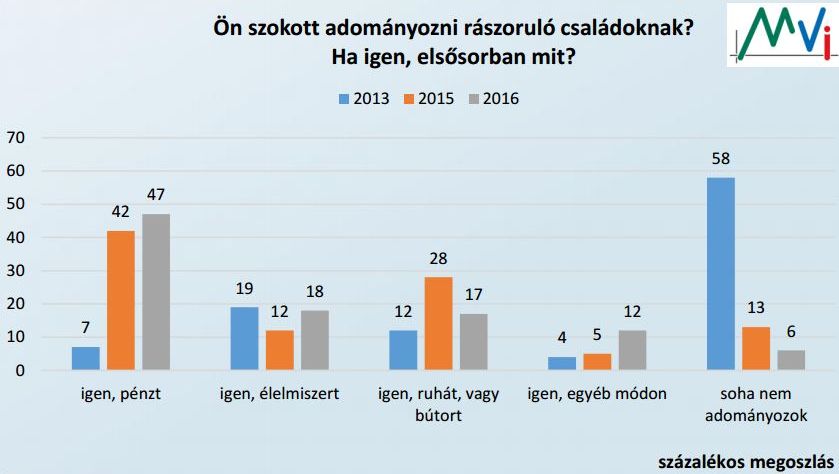 A Magyar Városkutató Intézet harmadik éve vizsgálja a fehérvári lakosok adományozási szokásait, az eredmények, és az előbb leírt példa is mutatják, adakozó kedvűek a megyeszékhelyen élők. A felmérés 2016. december 15. és 23. között készült, 300 helyi lakost kérdeztek meg telefonon adományozási szokásaikról. Azok közül a válaszadók közül, akik adakozni szoktak a rászoruló családoknak, 47 százalékuk általában pénzt, 18 százalékuk élelmiszert, 17 százalékuk pedig ruhát, vagy bútort ajánlnak fel. Mindössze 6 százalék azoknak a válaszadóknak az aránya, akik soha nem adományoznak. Korábban 2013-ban és 2015-ben is vizsgálták a fehérvári lakosok adományozási szokásait. Azt lehet látni, hogy növekedett az adományozási hajlandóság, és az adományozás módja is változott. Míg 2013-ban, akik adományoztak, elsősorban élelmiszert ajánlottak fel, 2015-ben leginkább a pénzbeli adományozás volt a jellemző, amely tendencia 2016-ban is változatlan maradt. A soha nem adományozók aránya továbbra is csökken, 58 százalékról 2015-ben 13 százalékra, 2016-ban pedig 6 százalékra csökkent. A kérdőívre válaszoló fehérváriak 70 százaléka saját maga intézi az adományozást. 2013-ban ugyanez az arány még csak 15 százalék volt, 2015-ben pedig 45 százalék. Az adományozó szervezeteket korábban még a lakosság 60 illetve 35 százaléka vette igénybe, 2016-ban viszont ez az arány lecsökkent 19 százalékra. Ismerősök közreműködésével a válaszadók 8-8 százaléka intézte az adományozást korábban, az idei vizsgált évben ez az arány lecsökkent 4 százalékra.
