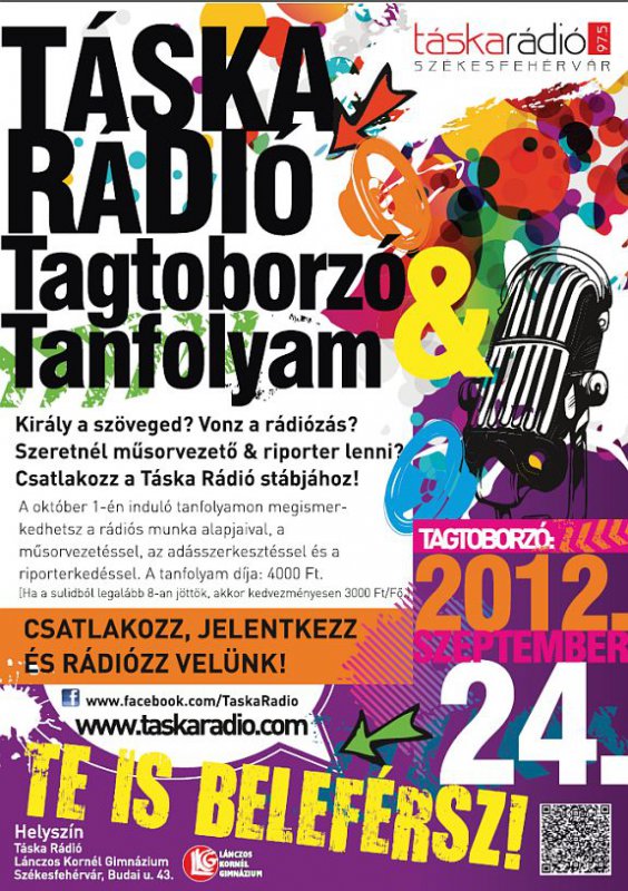 A Táska Rádió közszolgálati jelleggel működik 2010 áprilisa óta, a stábban 10 székesfehérvári iskola körülbelül 50 diákjai dolgozik heti egy-két alkalommal. A legfontosabb célok között szerepel, hogy valamennyi városi iskola hírei szerepeljenek a műsor-összeállításban olyan fiatalok közreműködésével, akiket érdekel a rádiózás és szívesen képeznék is magukat különböző területeken. A Budai út 43. szám alatti Lánczos Gimnáziumban szeptember 24-én, hétfőn 15.00 órakor kezdődő tagtoborzóra felső tagozatos és középiskolás, 12-20 éves diákok jelentkezését várják, akikkel hangfelvételt készítenek egy próba-hírolvasás során. Október 1-től tanfolyamot indítanak, melynek keretében hétfő délutánonként kétszer 45 perces foglalkozások során ismerkedhetnek a fiatalok a rádiózás különböző területeivel, például a műsorvezetéssel, hírszerkesztéssel, interjúk, riportok készítésével és a zenei szerkesztéssel. A képzés ára 4.000 forint, de abban az esetben, ha egy iskolából legalább nyolcan jelentkeznek, akkor fejenként 3.000 forintos kedvezményes áron biztosítják a részvételi lehetőséget. Jelentkezni és további információkat kérni a www.taskaradio.com vagy a www.facebook.com/TaskaRadio elérhetőségeken lehet.