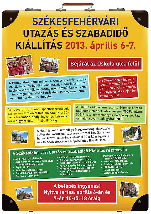 Április 6-a és április 7-e között rendezik meg a Hiemer-ház báltermében a Székesfehérvári Utazási és szabadidő Kiállítást. A rendezvényen a fehérvári utazási irodák hazai és külföldi kínálatával, a Tourinform Székesfehérvár rendkívül gazdag programajánlatával, valamint a régió kiemelkedő turisztikai látnivalóival ismerkedhetnek a kiállítás látogatói. A kiállítás időtartama alatt a Hiemer-házban található Hetedhét Játékmúzeum 700 Ft helyett 500 Ft-os, kedvezményes belépőjeggyel látogatható, a gyermekjegy ára 350 Ft.