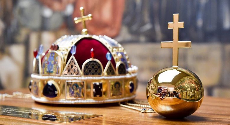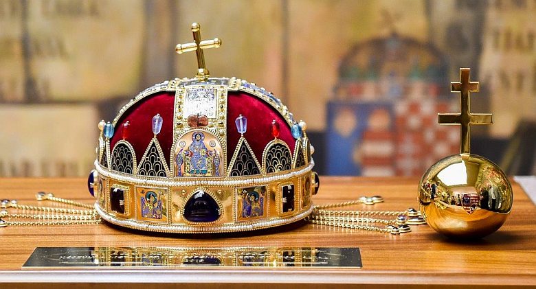 Az Országalma másolata is látható a Szent Korona hiteles másolata mellett