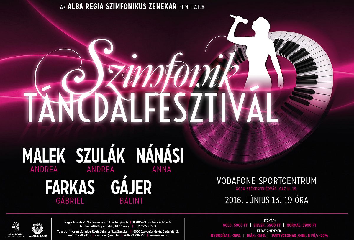 A Szimfonik Táncdalfesztivál június 13-án, hétfőn 19.00 órakor kezdődik az Alba Regia Sportcsarnokban. A fehérvári muzsikusok célja, hogy a fiatalabb generációkkal megismertessék és megszerettessék a régi, ám újragondolt és egészen sajátos módon hangszerelt slágereket. Az örökzöld dallamokat olyan sztárok előadásában hallhatják, mint Malek Andrea, Gájer Bálint, Szulák Andrea, vagy Farkas Gábriel. A dalokat hangszerelte Hámori János, a program karmestere Kökényessy Zoltán.