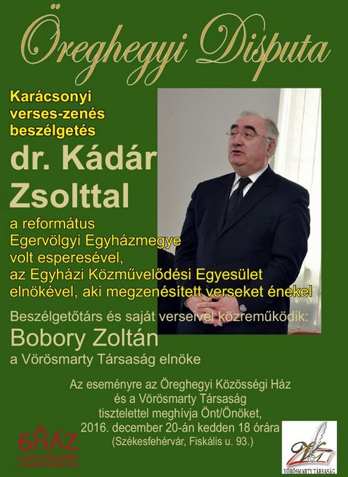 Kedden 18.00 órakor disputára hívják az érdeklődőket az Öreghegyi Közösségi Házba. A karácsonyi verses-zenés beszélgetés vendége dr. Kádár Zsolt, a református Egervölgyi Egyházmegye volt esperese, az Egyházi Közművelődési Egyesület elnöke lesz, aki megzenésített verseket fog énekelni. A beszélgetőtárs, aki saját verseivel közreműködik Bobory Zoltán.