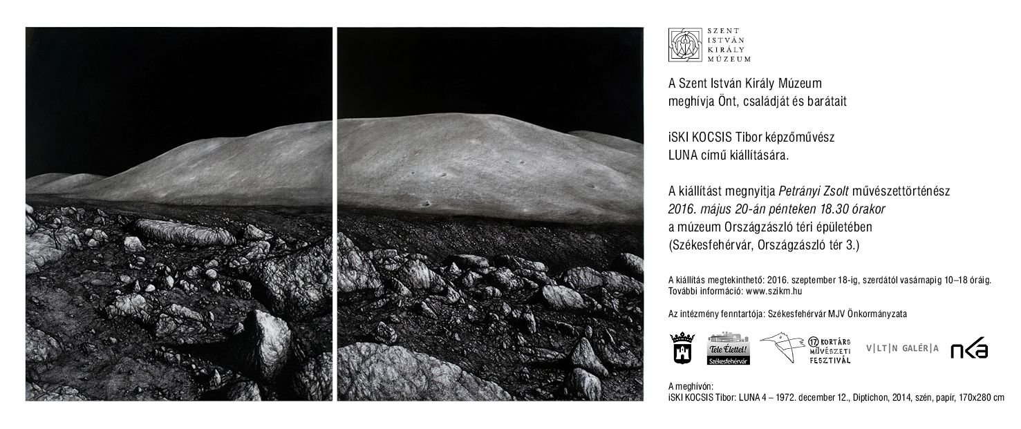 Iski Kocsis Tibor képzőművész kiállítása nyílik meg május 20-án, 18.30 órakor a Szent István Király Múzeum Országzászló téri épületében. A Luna című rajz-installációja egyéni művészi reflexiót fogalmaz meg a tudományos és kultúrtörténeti szempontból is kimagasló Apollo-programra. A tárlat 2016. szeptember 18-ig, szerdától vasárnapig 10–18 óráig látogatható.
