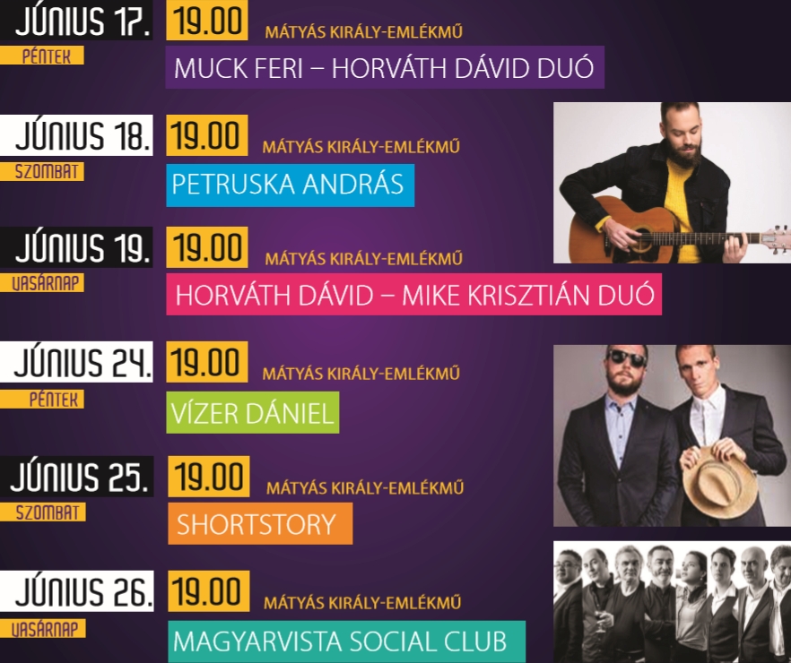 Június 24-e és június 26-a között 19 órától ismét a Mátyás király- emlékműnél csendülnek fel hangulatos dallamok a Fehérvári KultúrKorzó keretében. Pénteken Vízer Dániel jazzénekes, szombaton pedig a Shortstory lép színpadra, míg vasárnap a MagyarVista Social Club várja a zenekedvelőket a a Mátyás király- emlékműnél.