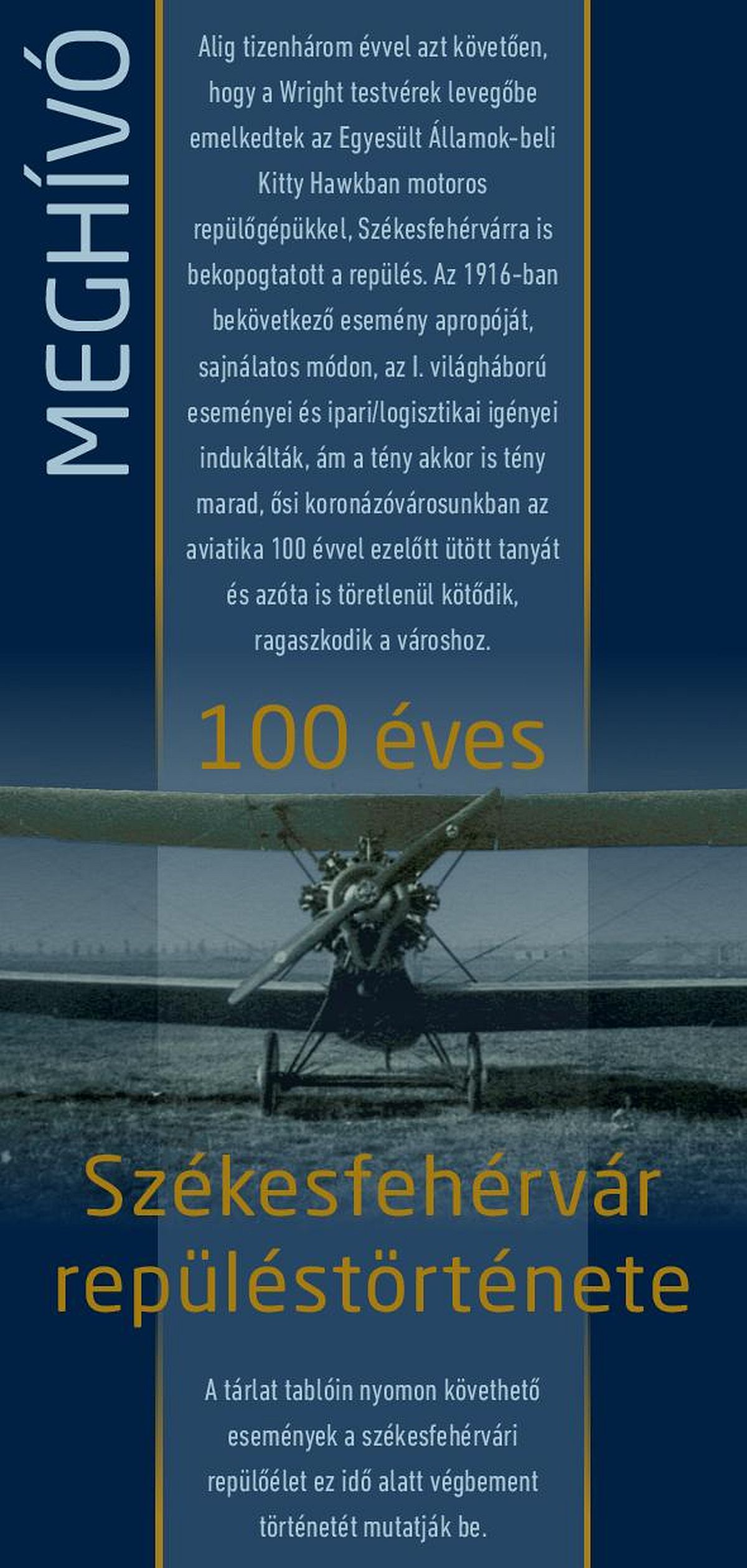 Székesfehérvár száz éves repülés- történetét bemutató tablókiállítás nyílik november 8-án, kedden a Városházán. A tárlat a kezdetektől a modern időkig dolgozza fel a témát a centenárium tiszteletére. A Városi Levéltár és Kutatóintézet kiállítása egy hétig a Városházán, majd ezt követően a Bartók Béla téren lesz látogatható.