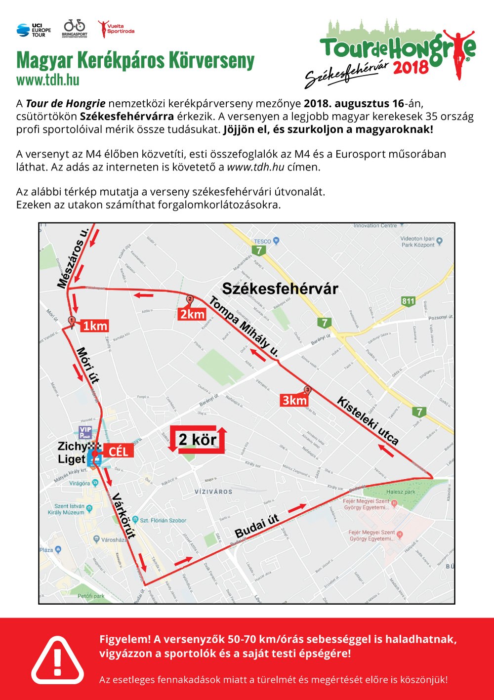 A Tour de Hongrie 2. szakasza során úgynevezett mozgó útzár kíséri a kerékpáros karavánt, ami rövid ideig tartó, időszakos lezárásokat jelent a teljes útvonalon. A célterületen, Székesfehérváron 2018. augusztus 16-án csütörtökön útlezárásokra, forgalmi változásokra kell számítani.
