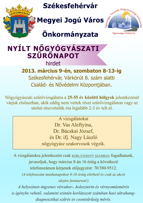 Március 9-én szombaton a vizsgálatokat Dr. Vas Aleftyina, Dr. Bácskai József és ifj. Dr. Nagy László nőgyógyász szakorvosok végzik. A reggel 8 órától 13 óráig tartó szűrésre elsősorban azon hölgyek jelentkezését várják, akik eddig nem, vagy 2-3 éve nem vettek részt ilyen vizsgálaton. Jelentkezni március 8-án 16 óráig lehet a 70/380-9512-es telefonszámon. A helyszínen ingyenes vércukor-, koleszterin és vérnyomásmérés is igénybe vehető.