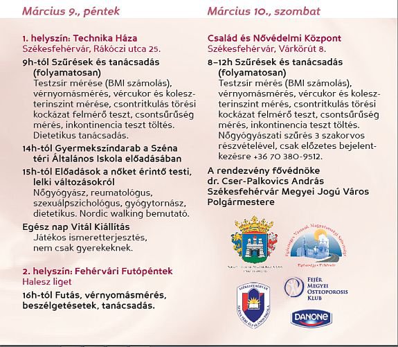 Egészségnapokat szerveznek március 9-én és 10-én Székesfehérváron: ingyenesen mérik majd többek között a testzsírt, vérnyomást, vércukor és koleszterinszinet, de lesz csontritkulás törési kockázat felmérő teszt, csontsűrűség mérés és dietetikus tanácsadás is. A rendezvény a két nap alatt három helyszínen, a Technika Házánál, a Halesz ligetben és a Család és Nővédelmi Központban lesz. A rendezvény fővédnöke dr. Cser-Palkovics András, Székesfehérvár polgármestere.