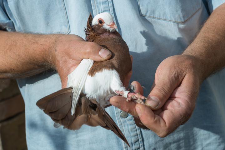 Minden példány lábán ott virított a színes gyűrű, ami a gyakorlatban a madár személyi igazolványának felel meg. A galambokat kéthetes korukban gyűrűzik meg, mert utána már nem lehet a számozott műanyag karikákat az állatok lábára ráhúzni.: „A gyűrűkön rajta van az európai szövetség rövidítése, a kelés éve és az egyedi sorszám. Ha a madár Magyarországon valahol elveszne, akkor a személyi alapján az interneten ki lehet deríteni, ki a tulajdonosa.” A másik fészekből első pillantásra egy sólyom és a galamb szerelemgyerekének tűnő madár bukkant elő. A bácskai hosszú csőrű keringő igazán érdekes látvány: egyszerre jámbor és félelmetes. Viszonylag nyugodtan pislogott kézben, viszont a fotózás nem igazán érdekelte, ezért egy hajtűkanyarral visszaszállt a fészekbe.