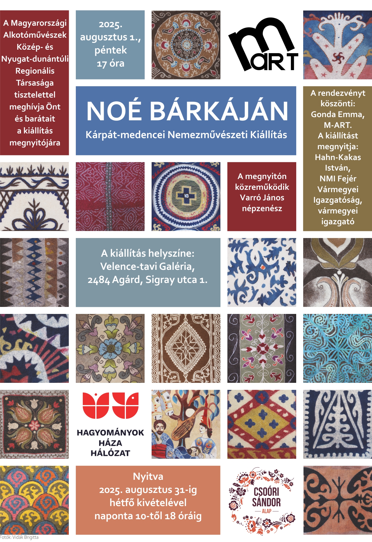 Öt ország hatvan alkotójának lenyűgöző művével várja látogatóit a Noé bárkáján Kárpát-medencei nemezművészeti kiállítás, amely augusztus 1-jén, pénteken 17 órakor nyílik a Velencei-tavi Galériában.
