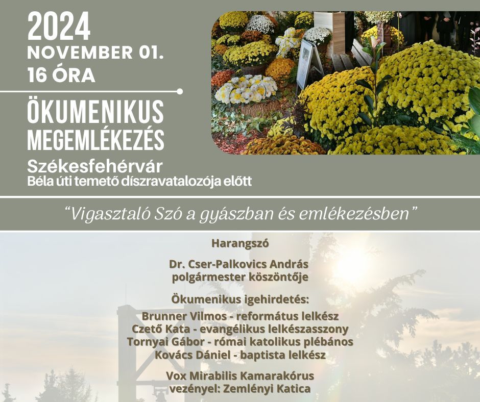 A város ökumenikus megemlékezése ”Vigasztaló Szó a gyászban és emlékezésben” címmel 2023. november 1-jén 16 órától lesz a Béla úti köztemető díszített ravatalozó udvarában. Az eseményen a történelmi egyházak képviselői imádsággal, szentbeszéddel emlékeztetnek az örök életre.